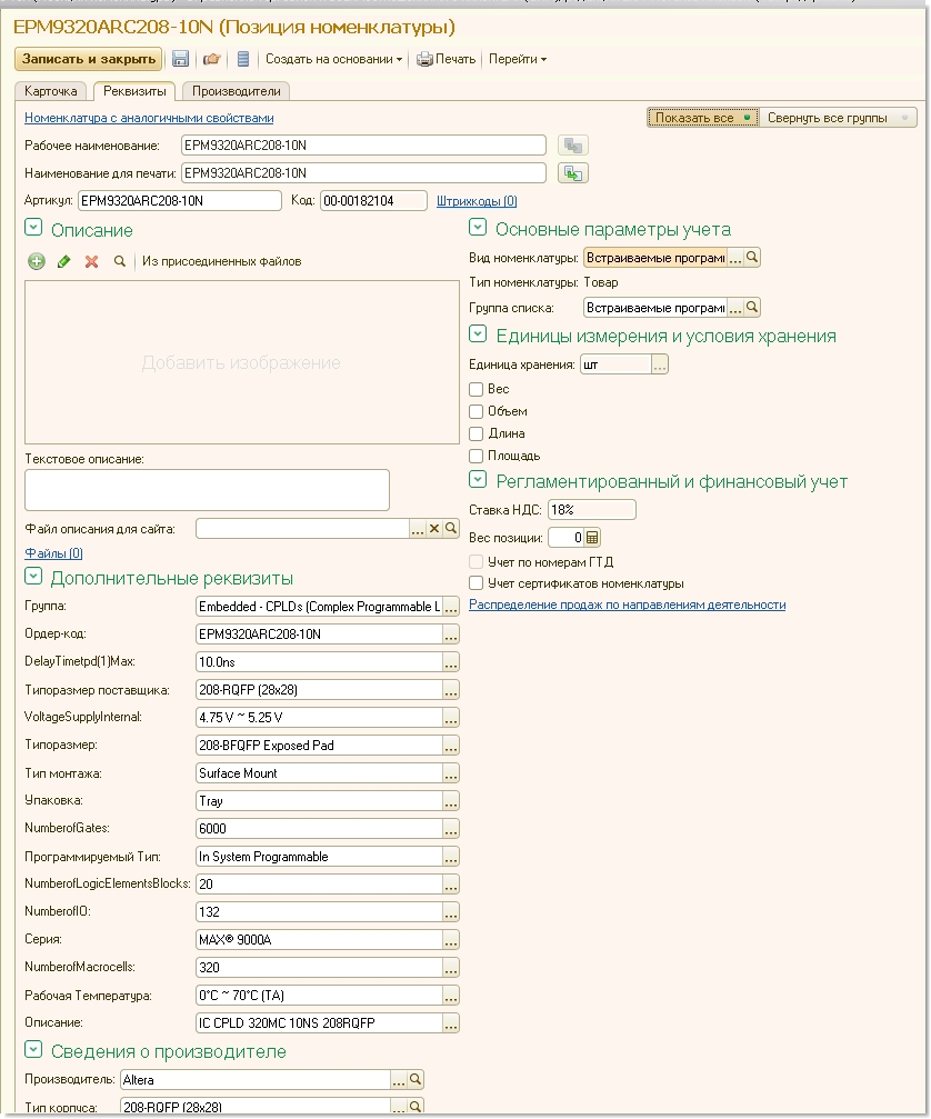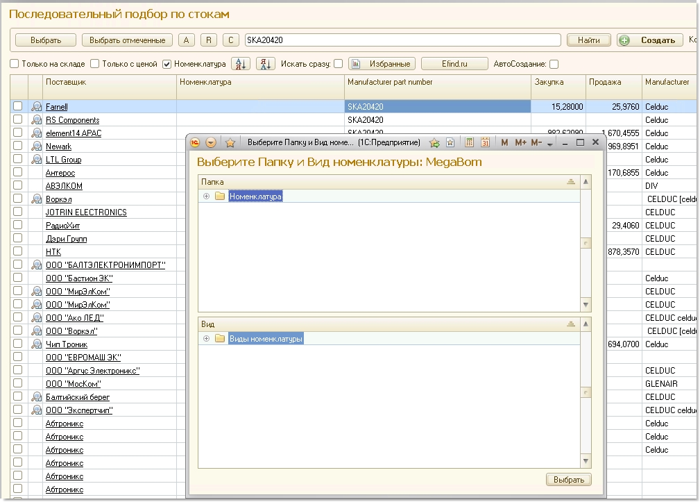 Облачный каталог электронных компонентов, который в реальном режиме времени выдает по запросу в 1С или другую информационную систему файл позиции, в котором есть картинка и дополнительные реквизиты. Эта функция также используется при поиске по стокам в 1С:УРМ, и созданию номенклатуры из последовательного поиска.