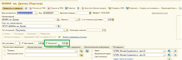 2. В Карточку контрагента с Тип отношений = Поставщик или в том числе Поставщик заполнить К1, как указано ниже: