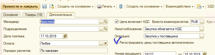 При поступлении товара, необходимо включать чек-бокс "Регистрировать цены поставщика автоматически"