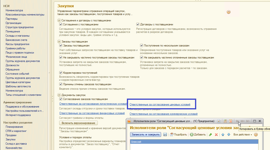 Дополнительно можно включить механизм согласования заказов поставщикам и назначить ответственных за утверждение