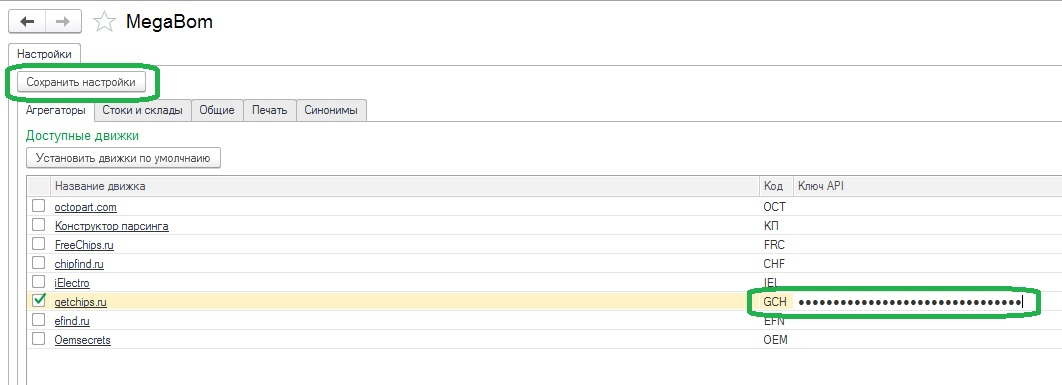 Во вкладке Агрегаторы найдем GetChips и отметим его галочкой. В столбце Ключ API двойным кликом активируем окно для ввода.