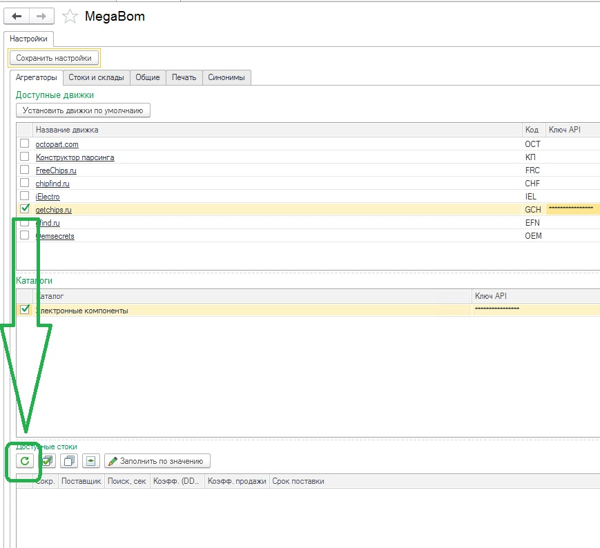 Далее - вниз к Доступным стокам и нажимаем кнопку Обновить стоки (см. скрин ниже)