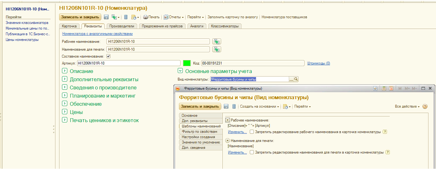 - настройка генерации наименований по значениям дополнительных реквизитов;
