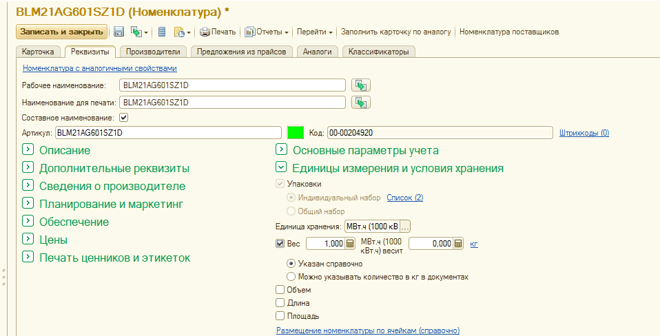 После записи основных реквизитов номенклатуры для продолжения ввода дополнительных данных будет автоматически установлен режим отображения всех реквизитов Показать все. Для ввода дополнительных данных удобно использовать режим с показом только названий групп реквизитов (Свернуть все группы), последовательно открывая группы реквизитов и заполняя в них данные.