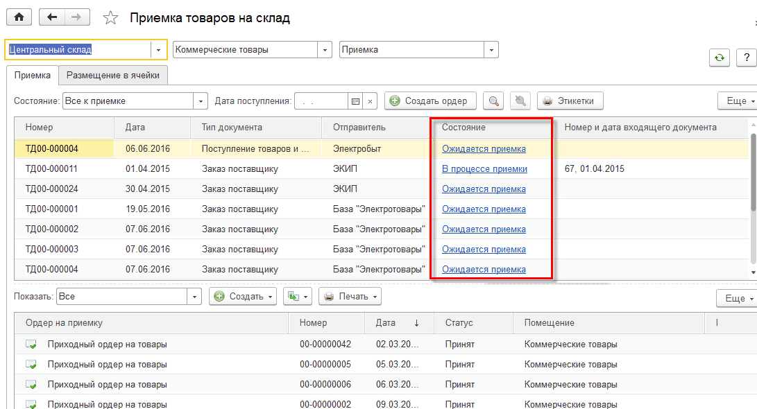 - текущее состояние процесса приемки товаров (колонка Состояние, значение которой представлено в виде гиперссылки).