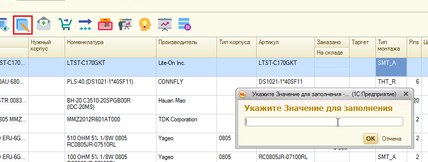 Текстовое или выбор номенклатуры из справочника (используется для создания спецификаций изделий в приборостроении)