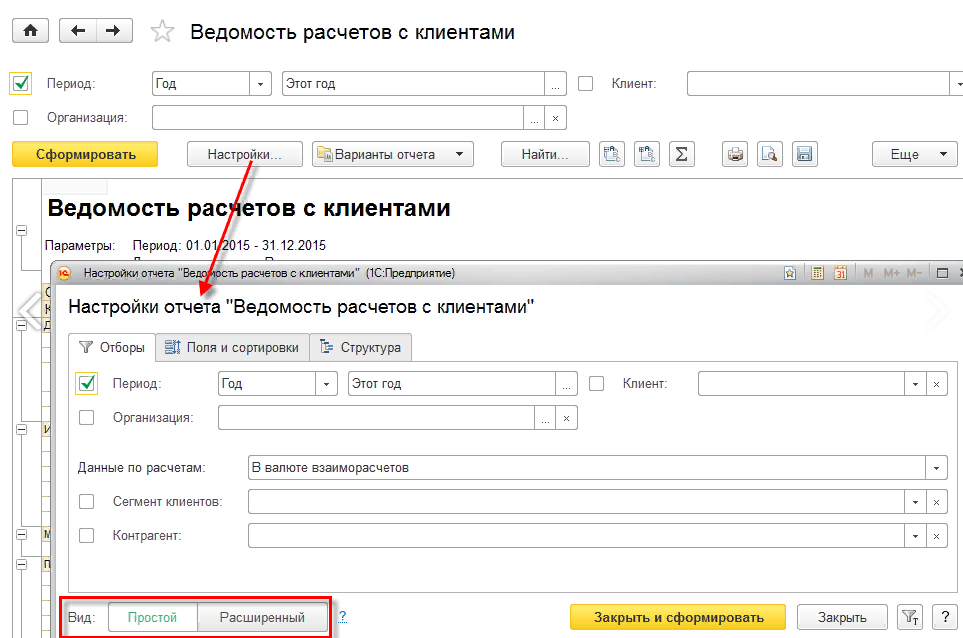 - Простой – позволяет менять настройки, которые не требуют последующего сохранения варианта отчета. Такие настройки будут применены при следующем открытии отчета. В состав простых настроек могут входить отборы, выводимые поля, сортировка и структура отчета.