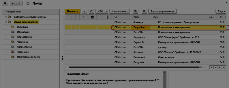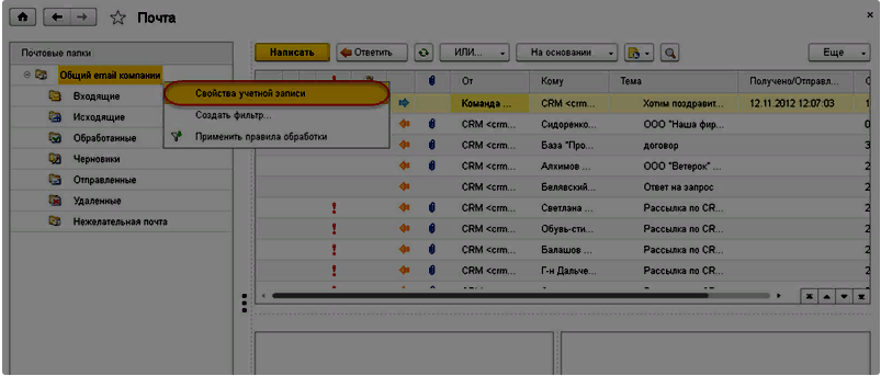 Встроенный почтовый менеджер использует возможности платформы «1С:Предприятия 8», основанные на протоколах IMAP, POP3, SMTP. Вся переписка с клиентами, контактными лицами и пр., а также их контактная информация сохраняются непосредственно в информационной базе.