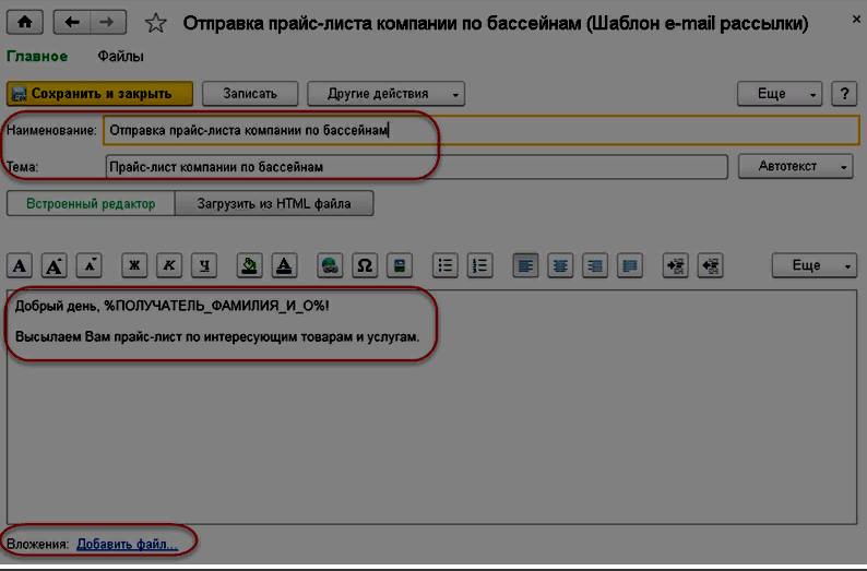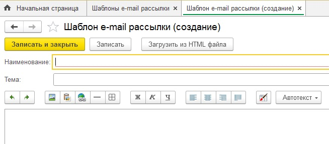 Примечание: Использование типа шаблона «Загрузить из HTML файла» позволяет вместо встроенного редактора в решении загрузить уже подготовленный файл в HTML формате, который будет вставляться в тело письма «как есть» без возможности его редактирования. Это удобно при создании красивых рассылок средствами внешних программ, позволяющих использовать все возможности форматирования языка HTML. В текст такого файла также могут быть вставлены теги, которые будут автоматически заполнены из решения 1С:CRM.