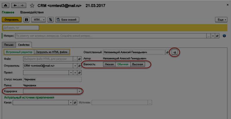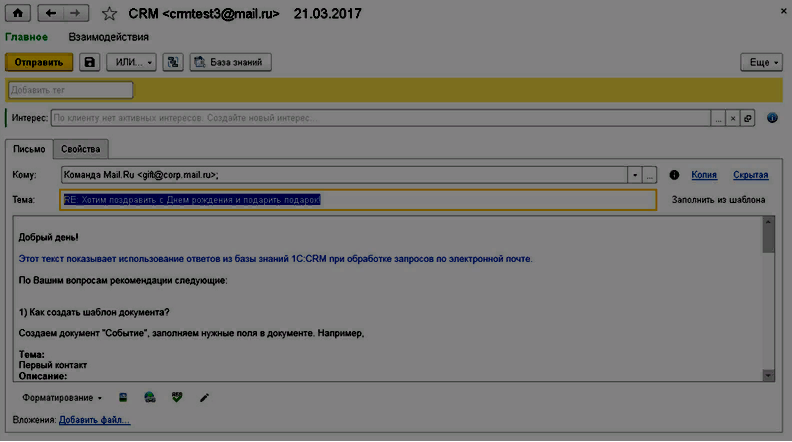 Пользователь сохраняет и закрывает форму. Теперь создает письмо, например, из Почты. В открывшейся форме исходящего письма добавляет Клиента в поле «Кому» и далее нажимает кнопку «Заполнить из шаблона». Выбирает необходимый шаблон и нажимает кнопку «Выбрать». Все заполнилось: