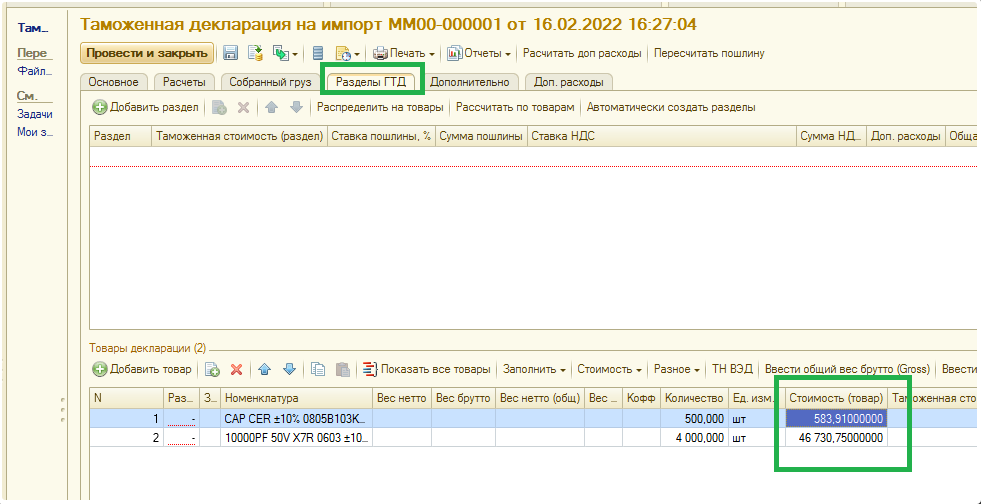 При этом в документе Таможенная декларация Валютные Цены, загруженные из Файла брокера будут сохранены в Разделе Собранный груз, а Цены в рублях на день документа будут Расположены в закладке Разделы ГТД.