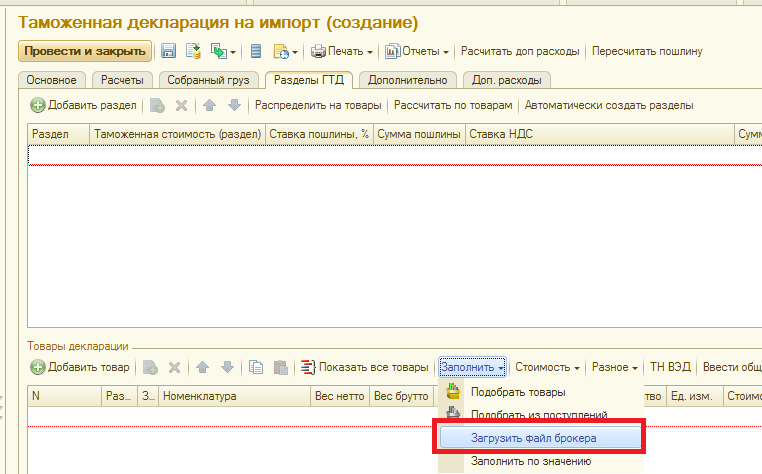 В документе Таможенная декларация на импорт открыть в закладке Разделы ГТД в подвал Товары декларации - Заполнить - Загрузить файл брокера