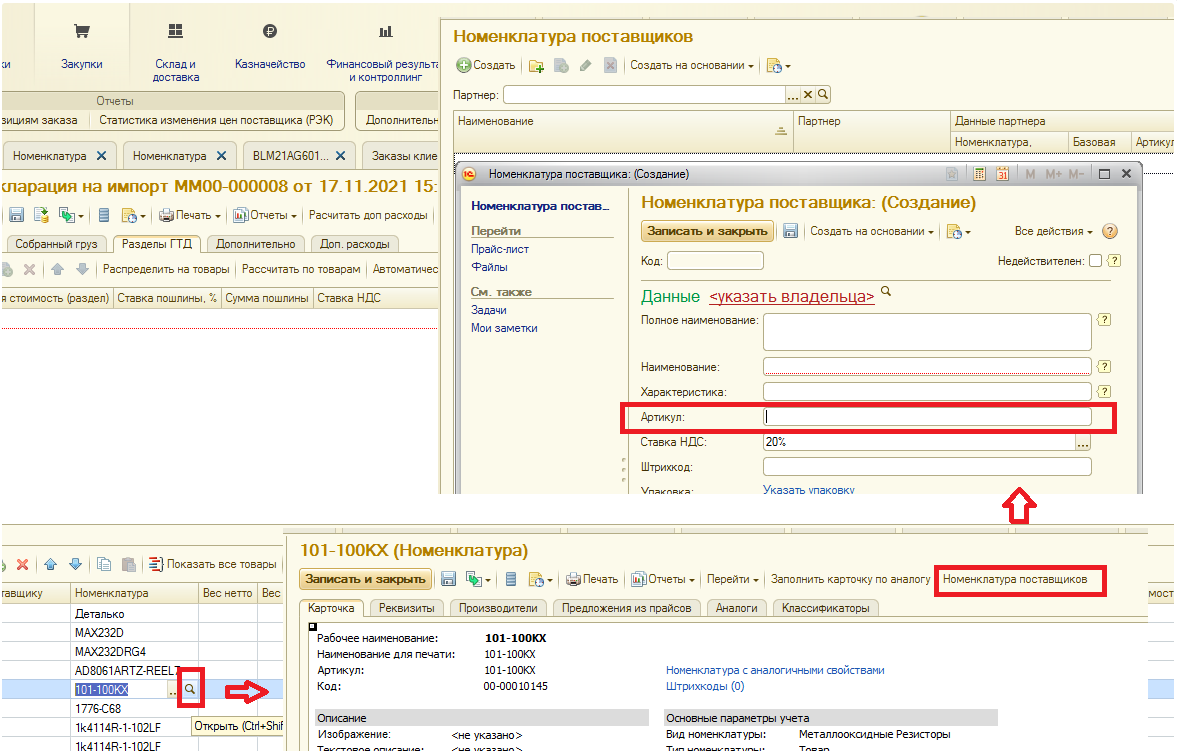 6. Артикул поставщика - переносит значение Артикул поставщика из колонки Файла/Карточки Номенклатуры в колонку Артикул поставщика в подвал Товары декларации раздела Товары декларации документа Таможенная декларация на импорт;