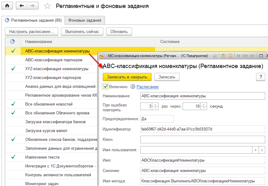 Автоматический запуск регламентных заданий можно регулировать флажком Включено в форме регламентного задания.