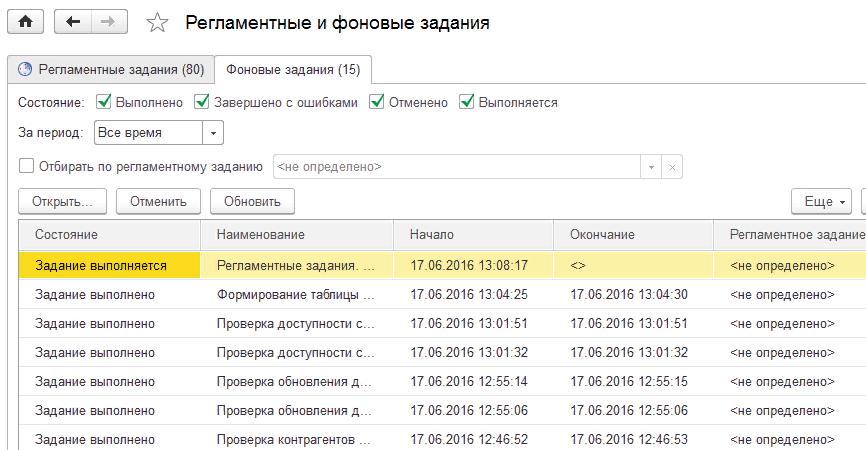 На закладке Фоновые задания есть возможность проконтролировать выполнение фоновых заданий. Для этого можно воспользоваться отбором фоновых заданий по интересующему регламентному заданию, периоду выполнения задания, состоянию (Выполнено, Завершено с ошибками, Отменено, Выполняется).