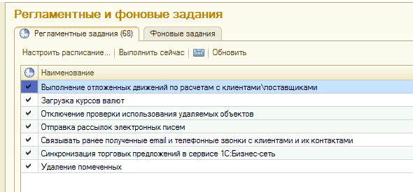 В конфигурации ряд действий выполняется по определенному расписанию регламентными заданиями. Регламентные задания могут создаваться на основе предопределенных шаблонов. Последние являются частью прикладного решения и создаются на этапе разработки системы. Расписание регламентного задания настраивается в режиме 1С:Предприятие. В соответствии с расписанием регламентное задание порождает фоновое задание, которое и выполняет заданные действия.