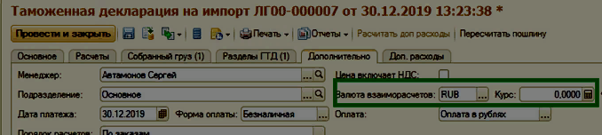 4.1 Автоматически при создании новой Таможенной декларации на импорт по кнопке На основании, все товары из документа Приобретение товаров и услуг переносятся в раздел Разделы ГТД - Товары декларации. Суммы в валюте пересчитываются в рубли по текущему курсу на день создания документа.
