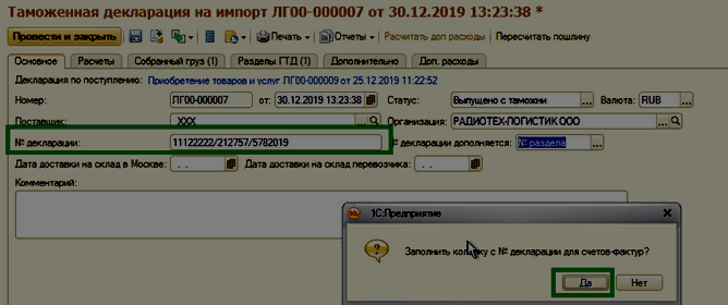 В открывшемся окне при нажатии на кнопку Да, значение № декларации с постфиксом = нумерация по порядку, запишется в строки № декларации для с/ф в закладке Товары ГТД.