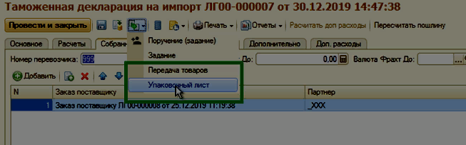 7. На основании проведенного документа Таможенная декларация на импорт можно создать документы Передача товаров и Упаковочный лист по одноименной кнопке. (опции подключаются отдельно)