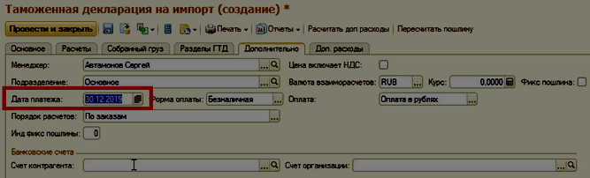 1. В созданном документе, в закладке Дополнительно, вносим дату в поле Дата оплаты.