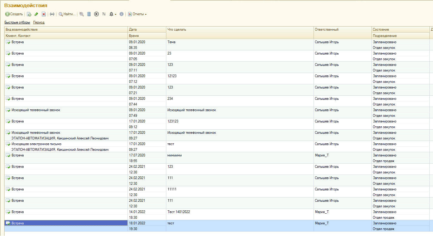 Для контроля и учета результатов работы по взаимодействиям с клиентами можно использовать отчет Календарь событий (раздел Главное – Почта, задачи).