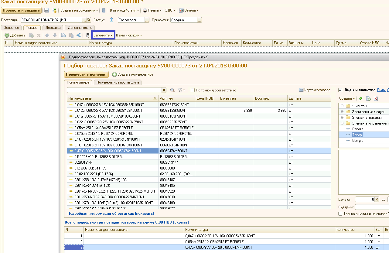 или путем прямого поиска по вхождению заполняем заказ позициями, количества и ценами.