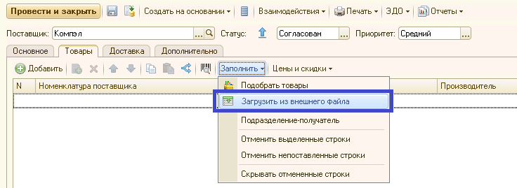 Выбираем пункт меню "Заполнить - Загрузить из внешнего файла"