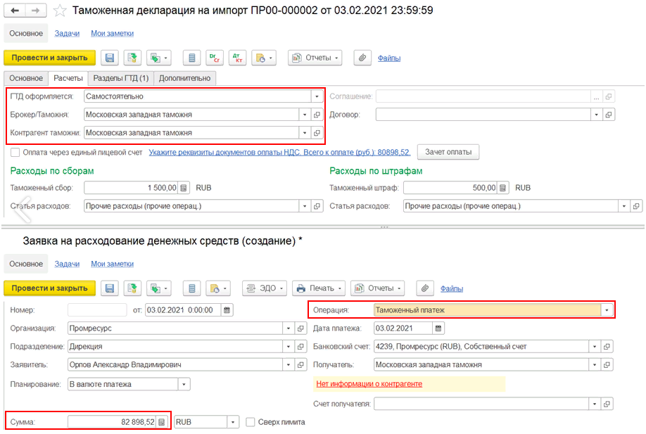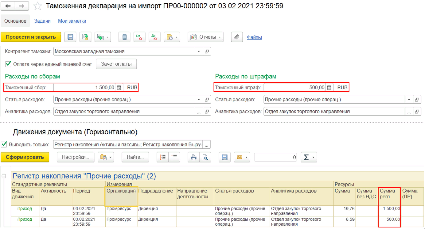 Суммы таможенных сборов и штрафов, которые взимаются на таможне, указываются на закладке Расчеты в соответствующих разделах таможенной декларации Расходы по сборам и Расходы по штрафам. Эти расходы относятся на соответствующую статью расходов. В зависимости от указанной статьи расходов эти расходы могут быть распределены по направлениям деятельности, на себестоимость товаров, на расходы будущих периодов в соответствии с указанной в статье расходов аналитикой.