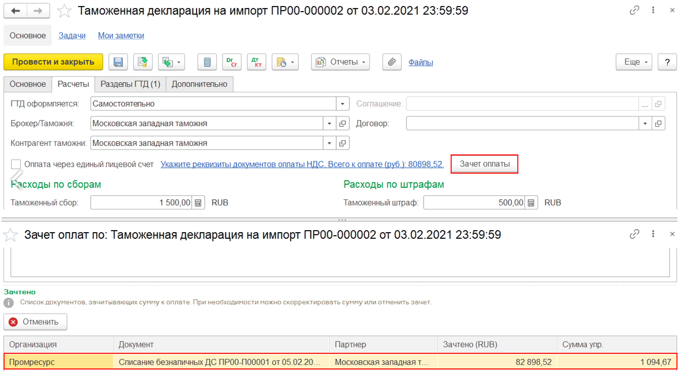 - перечислением денежный средств на расчетный счет таможни или брокера (документ Списание безналичных денежных средств). Оплата может быть оформлена по предварительной заявке на расходование денежных средств. Для регистрации платежа по конкретной таможенной декларации надо произвести операцию зачета оплаты (команда Зачет оплаты в документе).