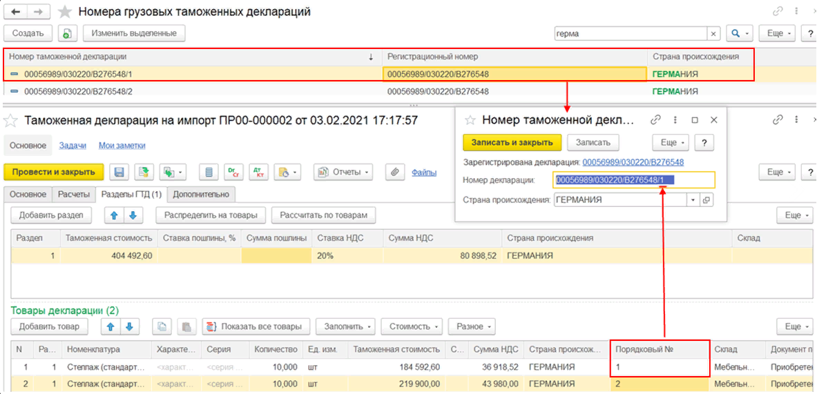 Значения, введенные поле Порядковый №, сохраняются в справочнике Номера ГТД в реквизите Номер декларации.