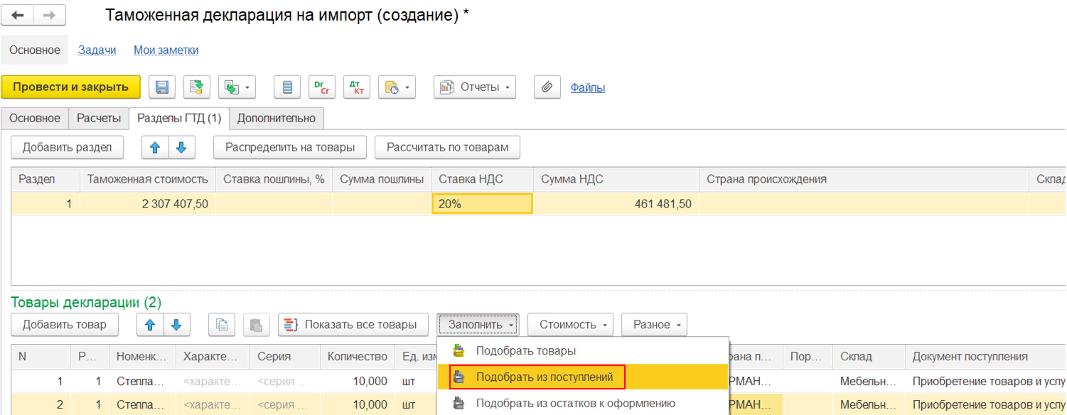 Предусмотрена также возможность заполнить товары в разделах таможенной декларации в соответствии с остатками импортных товаров (команда Заполнить – Подобрать из остатков к оформлению).