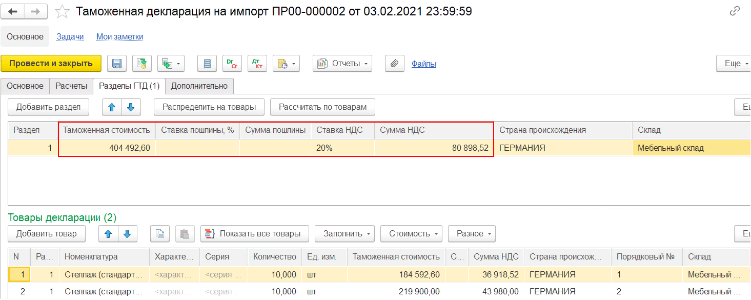 Заполнение информации о товарах, таможенных пошлинах и НДС.