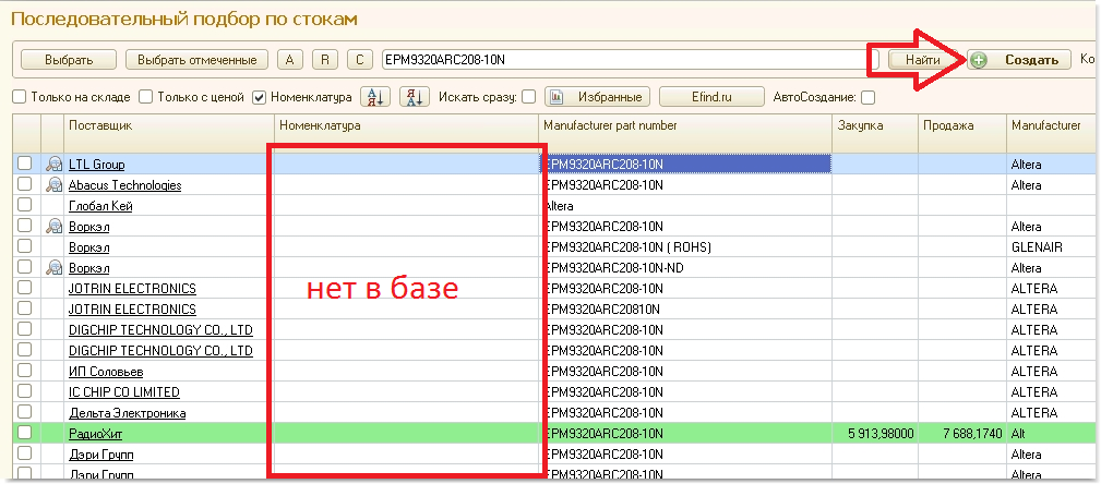 После нажатия кнопки "Создать", позиция ищется в эталонном каталоге, и сразу записывается. Признак того, что эта позиция есть базе, заполненные графы в столбце "Номенклатура".
