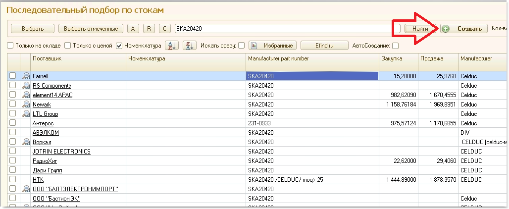 Облачный каталог электронных компонентов, который в реальном режиме времени выдает по запросу в 1С или другую информационную систему файл позиции, в котором есть картинка и дополнительные реквизиты. Эта функция также используется при поиске по стокам в 1С:УРМ, и созданию номенклатуры из последовательного поиска.