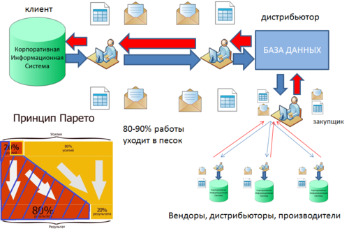 Если посмотреть, что происходит внутри данного процесса, то мы увидим, что менеджер выполняет или должен выполнить ряд типовых операций, таких как получение заявки от клиента, занесение заявки в базу, просчет заявки, которые могут осуществляться как непосредственно менеджером так и закупщиком. Закупщик полученную заявку транслирует определенным поставщикам, определенные позиции. Далее, закупщик собирает ответы от поставщиков и заносит их в базу, откуда их "достает" менеджер по продажам, формирует коммерческое предложение и отправляет его клиентам. Как говорится быстро сказка сказывается, но не быстро дело делается. Пока заявка приходит клиенту обратно, может пройти несколько дней, а то и не придти вовсе. Но по статистике, 80-90% работы уходит в песок, поэтому некоторые дистрибьюторы особо не любят перерабатываться. И большинство операций выполняется спустя рукава, или не выполняется вообще.