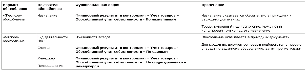 В регистрах оперативного учета прикладного решения поддерживается так называемое «жесткое» и «мягкое» обособление товаров, применение которого определяется значениями функциональных опций меню НСИ и администрирование – Настройка НСИ и разделов, приведенных в таблице.