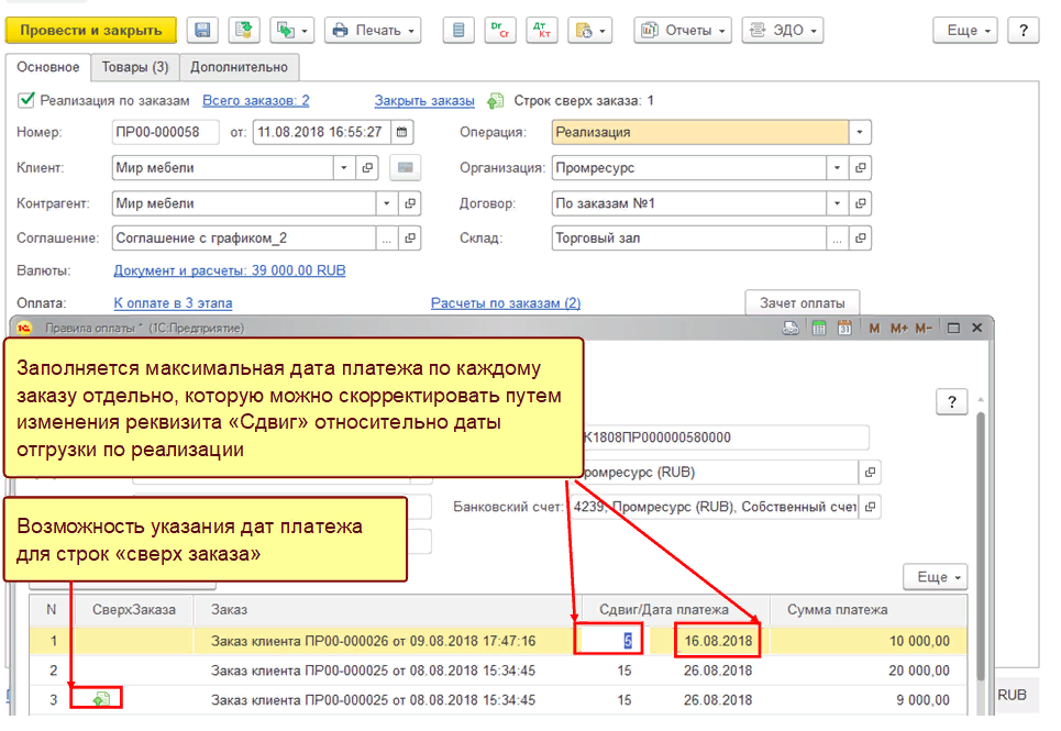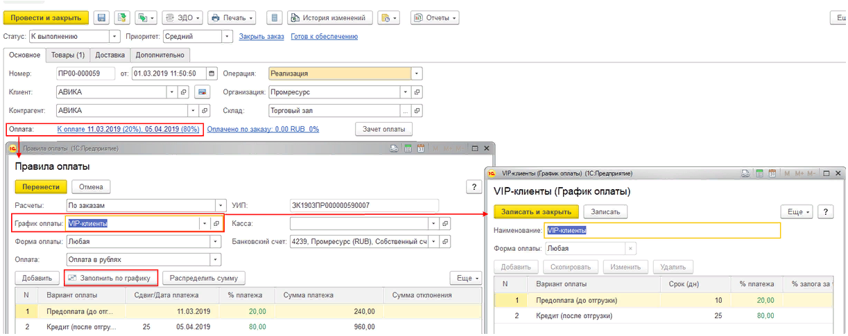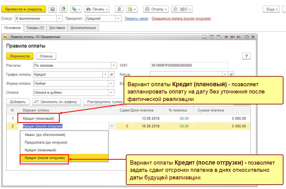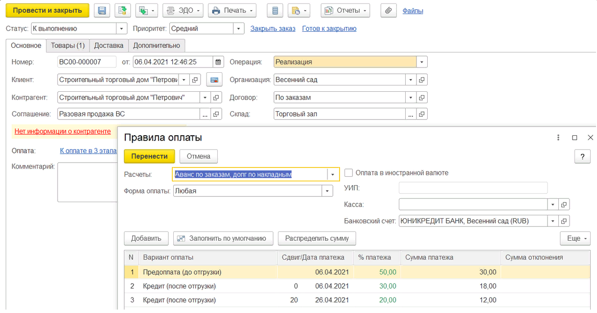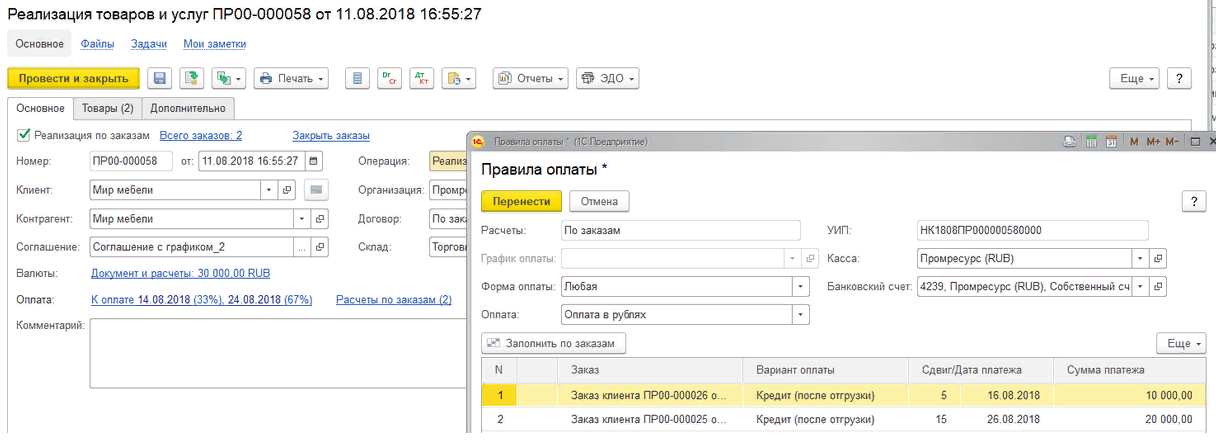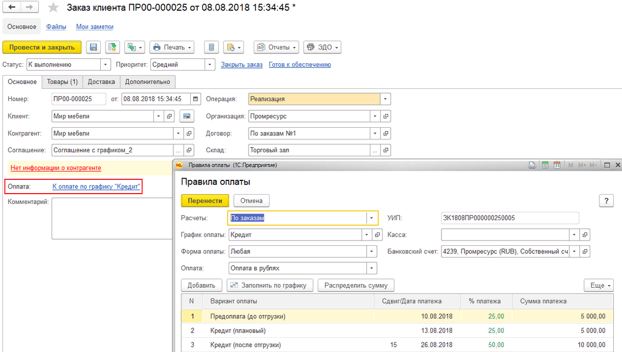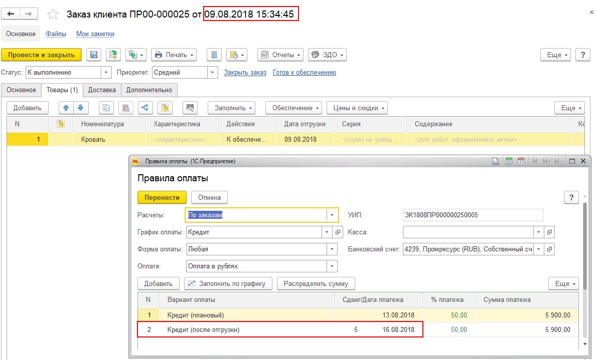 Например, заказ клиента от 08.08.18 г., желаемая дата отгрузки по заказу клиента 11.08.18 г. В правилах оплаты заказа указан предоплатный этап оплаты и несколько кредитных этапов оплаты.