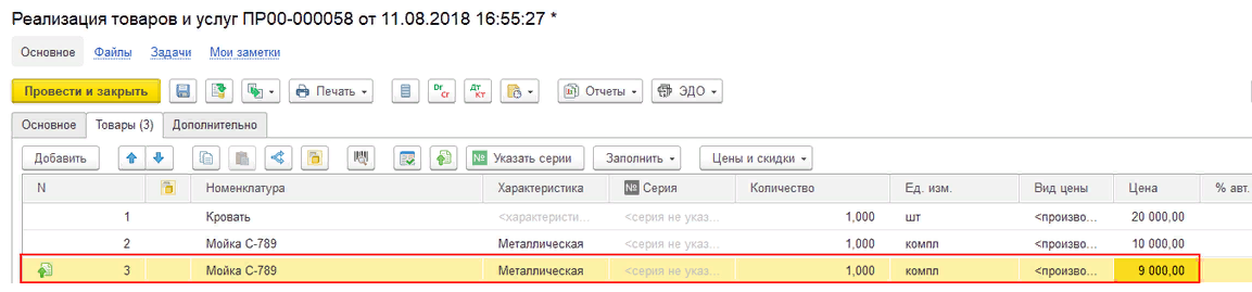Дополнительно в табличную часть накладной добавим строку сверх заказа.