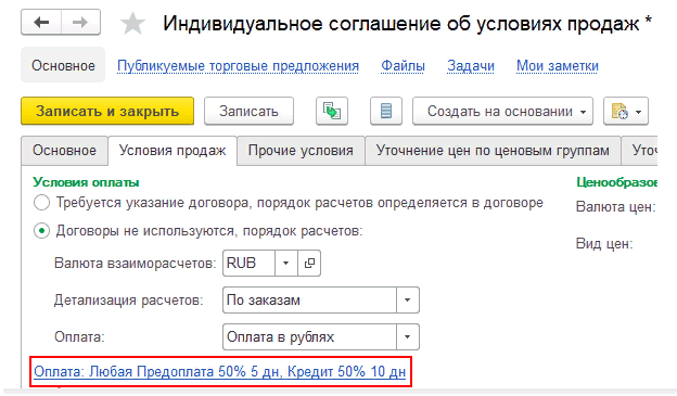 - Предоплата и/или Кредит – упрощенный вариант планирования оплаты. Оплату можно разбить на два этапа Предоплата (до отгрузки) или Кредит (плановый) или выбрать оплату только по одному из них. Этапы оплаты можно задать в соглашении. По указанным этапам оплаты соглашения будут заполняться правила оплаты заказов/накладных.