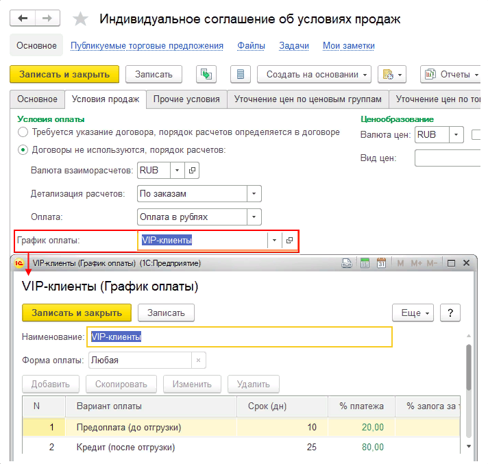 Если используется вариант планирования Шаблоны графиков оплаты, то график оплаты можно указать в типовом или индивидуальном соглашении. Этапы оплаты заказа, накладной будут заполнены по графику оплаты соглашения.