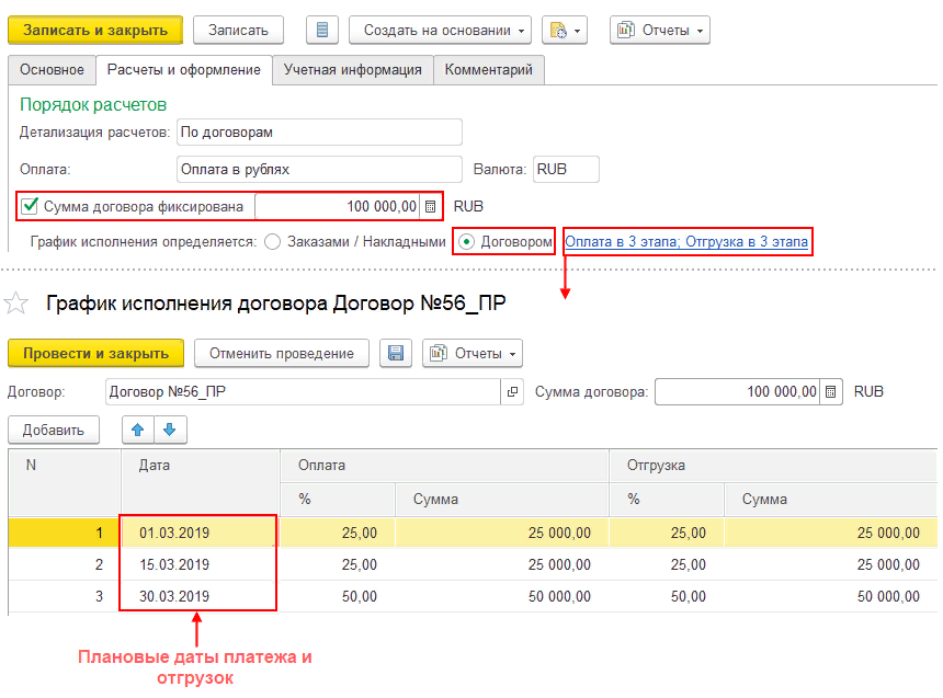 График оплат и отгрузок можно задать в договоре, если используется порядок расчетов «По договорам», «Аванс по договорам, долг по накладным» и график исполнения определяется договором. Потребуется задать сумму договора, которая будет распределена по датам платежей графика исполнения договора в соответствии с % оплаты.