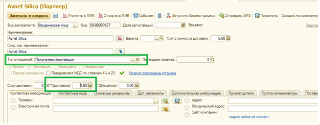 2. В Карточку контрагента с Тип отношений = Поставщик или в том числе Поставщик заполнить К1, как указано ниже: