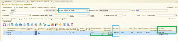 3. Создать документ Спецификация, заполнить поле Заказчик и далее осуществлять стандартный просчет позиций документа Спецификация.