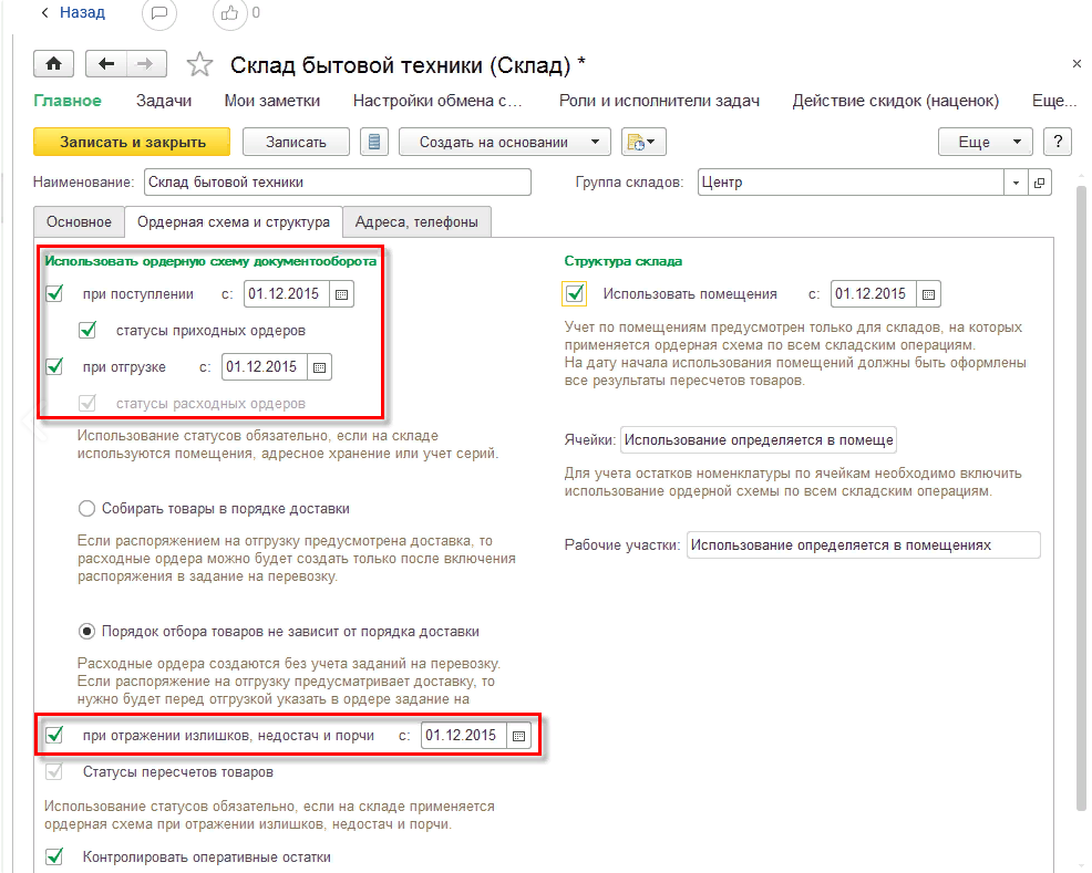 На каждом складе можно индивидуально настроить применение ордерной схемы для различных видов складских операций. Например, можно использовать ордерную схему при поступлении товаров, но не использовать при отгрузке и проведении инвентаризации (отражении излишков, недостач и порчи товаров). Ордерную схему документооборота можно применять только при использовании помещений. В этом случае накладные оформляются по складу, а при оформлении складских ордеров на отгрузку (прием) товаров обязательно указывается помещение.