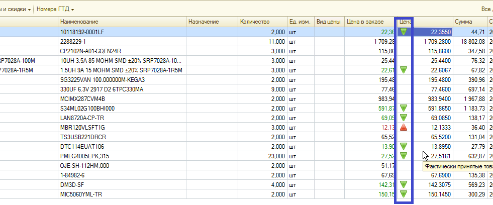 И при последующих поступлениях, в документе поступления будут появляться индикаторы типа больше-меньше