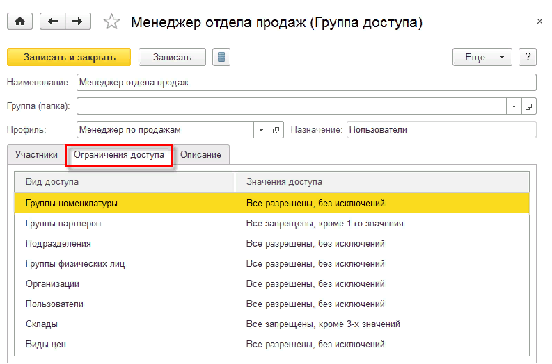 Ограничения по видам доступа устанавливаются на закладке Ограничения доступа в форме Группа доступа. Конкретные значения, к которым будет предоставлен доступ, устанавливаются на закладке Ограничения доступа для Профилей групп доступа и для Групп доступа.