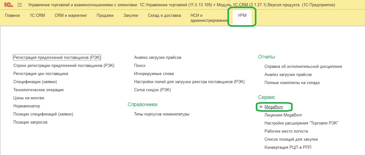 Заходим в раздел УРМ, в нем мы найдем Сервис - MegaBom.