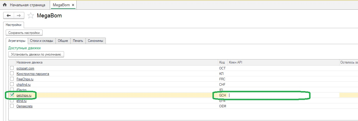 Во вкладке Агрегаторы найдем GetChips и отметим его галочкой. В столбце Ключ API двойным кликом активируем окно для ввода.