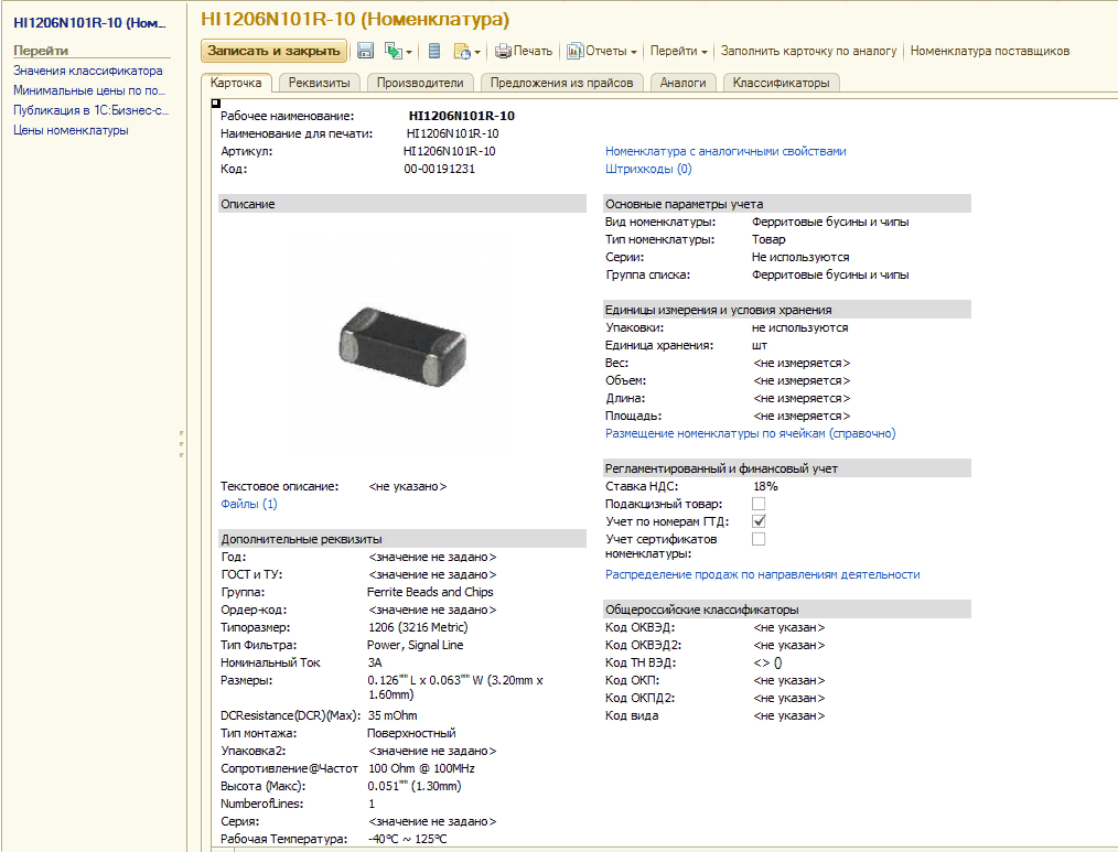 В карточку номенклатуры можно добавить любое количество дополнительных реквизитов, причем для каждого вида номенклатуры, характеристик и серий может быть определен свой набор дополнительных реквизитов.