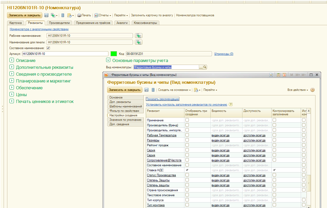 - настройка контроля обязательного заполнения, отображения (по умолчанию) и контроля уникальности реквизитов при создании новой номенклатурной позиции;